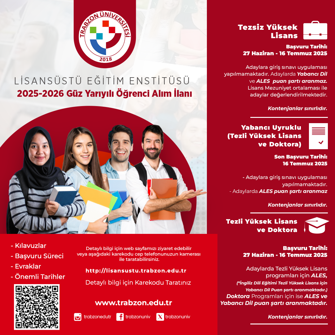 2025-2026 Eğitim Öğretim Yılı Güz Yarıyılı Lisansüstü Başvuru Kılavuzu, Kontenjanlar ve Başvuru Şartları için tıklayınız.