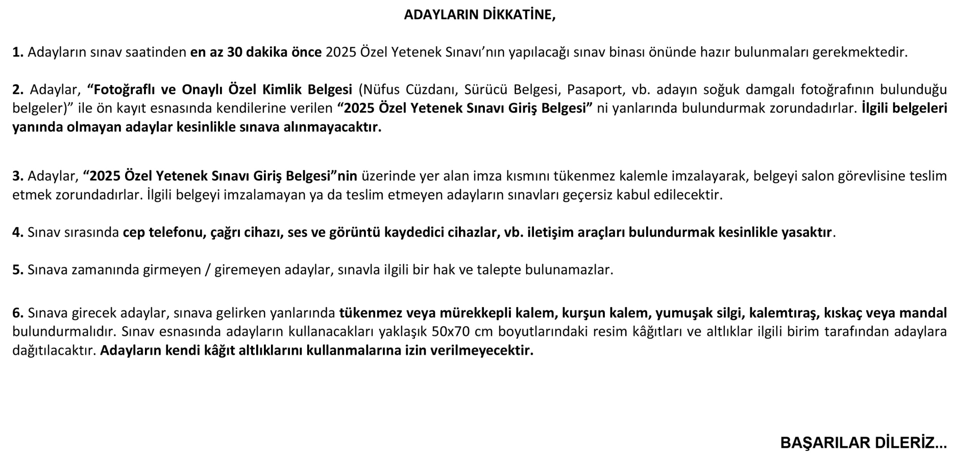 2025-2026 Özel Yetenek Sınavı'na girecek olan adaylar için sınav yerleri belirlenmiştir. Sınav yerlerini gösteren belgeye buraya tıklayarak ulaşabilirsiniz.