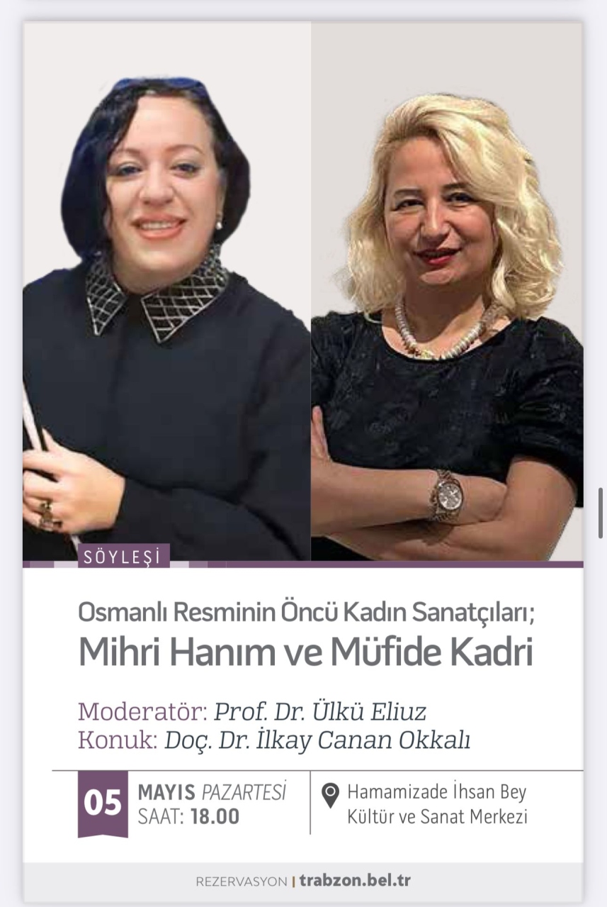 Fakültemiz Dekan Yardımcılarından Doç. Dr. İlkay Canan OKKALI, Trabzon Büyükşehir Belediyesi’nin ev sahipliğinde Kültür ve Sosyal İşler Dairesi Başkanlığı tarafından organize edilen Mayıs ayı kültür, sanat ve toplum temalı söyleşi ve seminer programları kapsamında 05 Mayıs 2025 tarihinde saat 18.00'da "Osmanlı Resminin Öncü Kadın Sanatçıları: Mihri Hanım ve Müfide Kadri" başlıklı söyleşi programında Prof. Dr. Ülkü ELİUZ'un konuğu olacaktır.