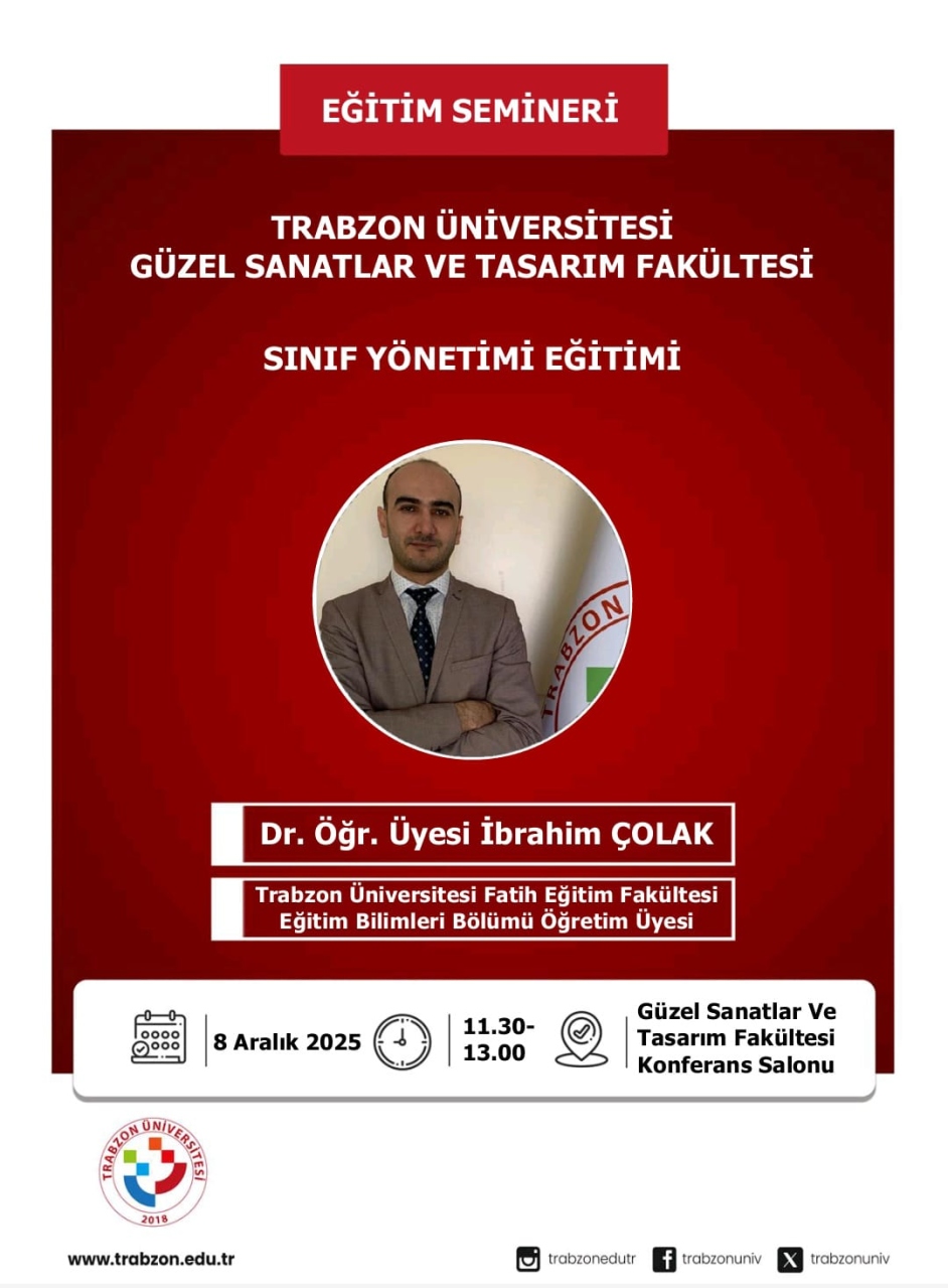 Trabzon Üniversitesi Fatih Eğitim Fakültesi Eğitim Bilimleri Bölümü Öğretim Üyesi Dr. Öğr. Üyesi İbrahim ÇOLAK tarafından, 08 Aralık 2025 tarihinde 11.30 - 13.00 saatleri arasında fakültemiz konferans salonunda öğretim elemanlarımıza yönelik "Sınıf Yönetimi Eğitimi" başlıklı bir seminer gerçekleştirilecektir.