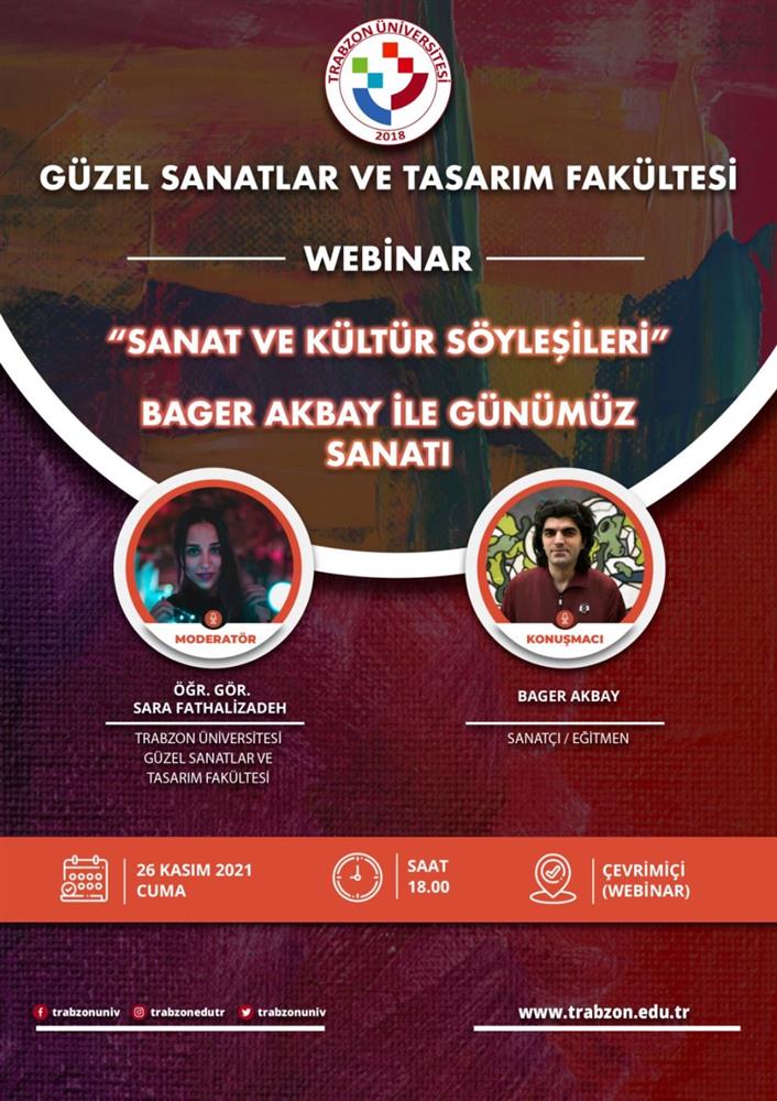 26 Kasım 2021 tarihinde Öğr. Gör. Sara FATHALİZADEH moderatörlüğünde Sanatçı/Eğitmen Bager AKBAY ile "Sanat ve Kültür Söyleşileri" kapsamında "Günümüz Sanatı" isimli webinar düzenlenecektir. Tüm akademik personel ve öğrencilerimize duyurulur. Webinar'ın linkine buraya tıklayarak ulaşabilirsiniz.