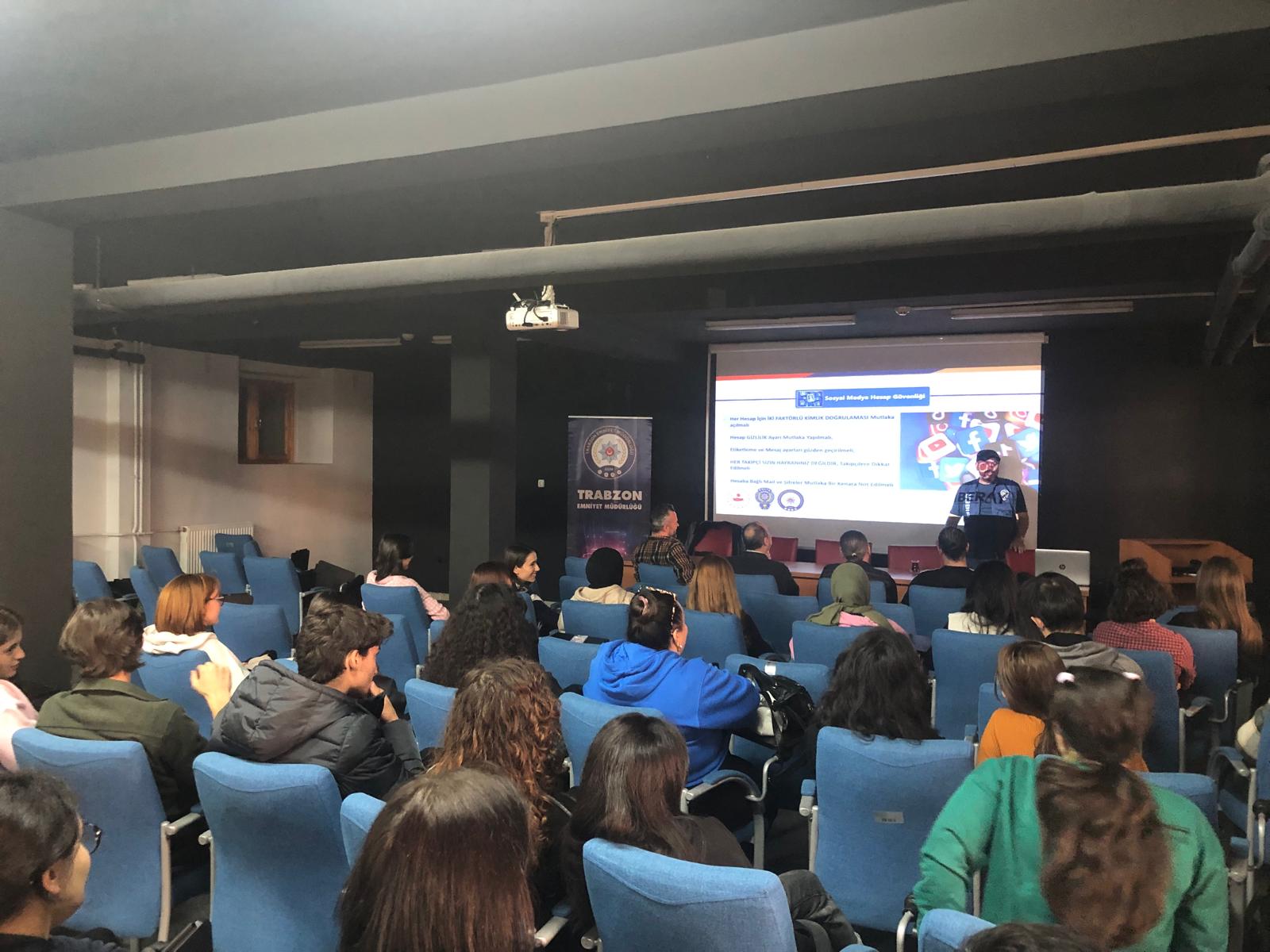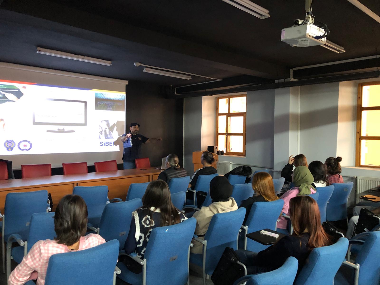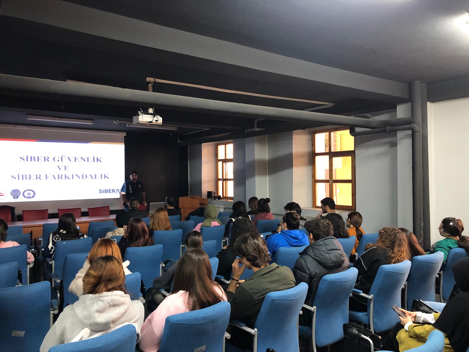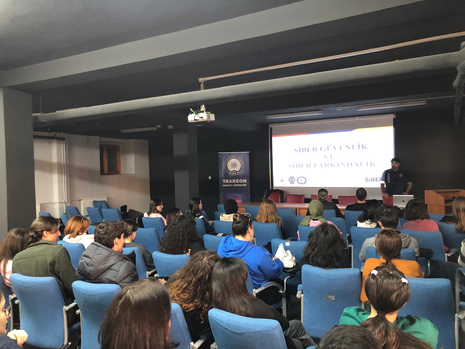 Trabzon İl Emniyet Müdürlüğü Siber Suçlarla Mücadele Daire Başkanlığı bünyesinde başlatılan internet bağımlılığı ve bilinçli internet kullanım projesi SİBERAY faaliyetleri kapsamında, Trabzon İl Emniyet Müdürlüğü Siber Suçlarla Mücadele Şube Müdürlüğü’nde görevli Siber Suç Soruşturma ve Araştırma Uzmanı İlhan TOZLUYURT tarafından fakültemiz personel ve öğrencilerine yönelik “Temel Siber Güvenlik, Bilişim Suçları, Sosyal Medya ve İnternet Dolandırıcılıkları” hususlarında farkındalık oluşturmak amacıyla 30 Ekim 2024 tarihinde eğitim semineri verilmiştir.