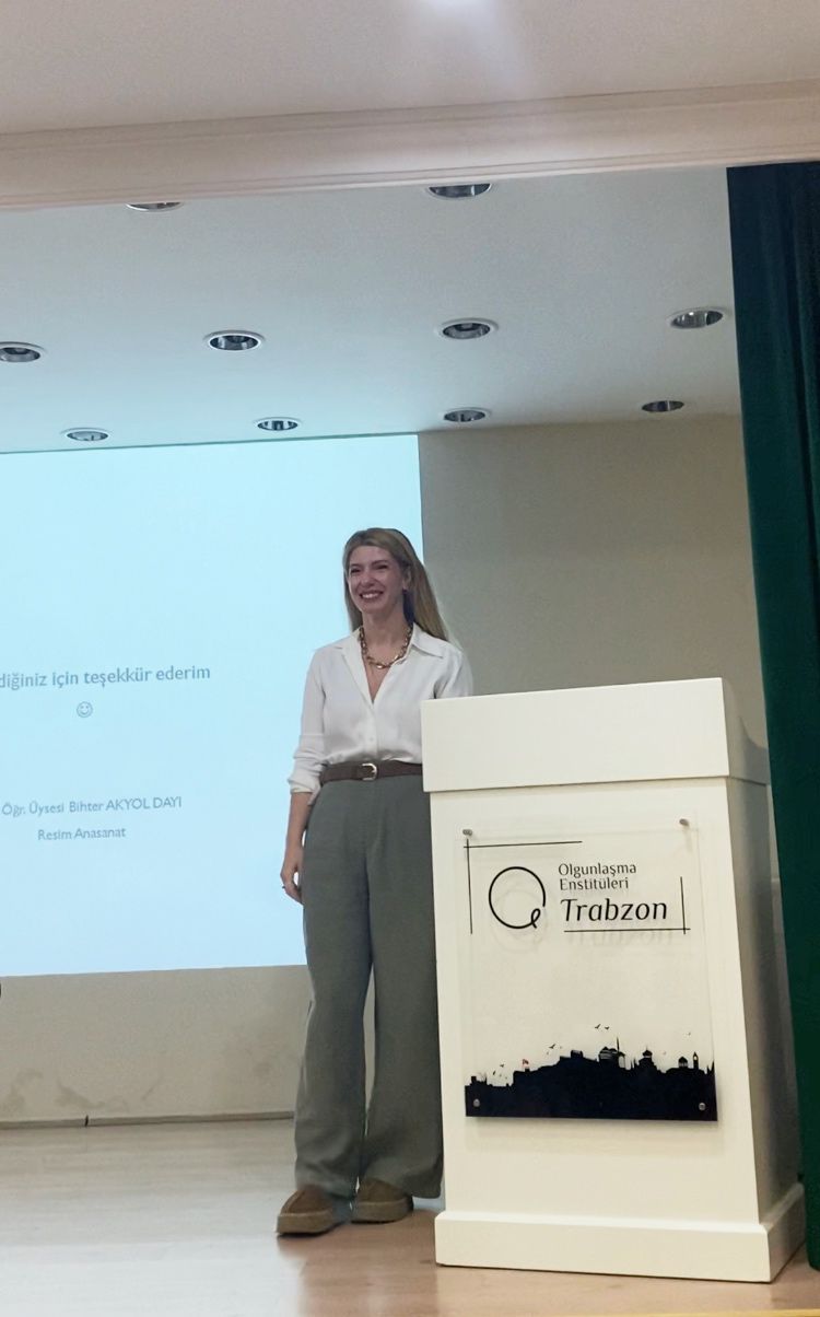 Fakültemiz Resim Bölümü akademisyenlerinden Dr. Öğr. Üyesi Bihter AKYOL DAYI, 14.05.2025 tarihinde Trabzon Olgunlaşma Enstitüsü konferans salonunda “Tasarımda Yenilikçi Yaklaşımlar” başlıklı konferans sunumunu gerçekleştirmiştir. Yenilikçi tasarım yaklaşımlarını ele alırken görme biçimlerinin tarihsel boyutunu; sanat ve tasarım ilişkileri ile yenilikçi tasarım ve sanatın etkileşimi ekseninde açıklayarak ifade etmiştir.