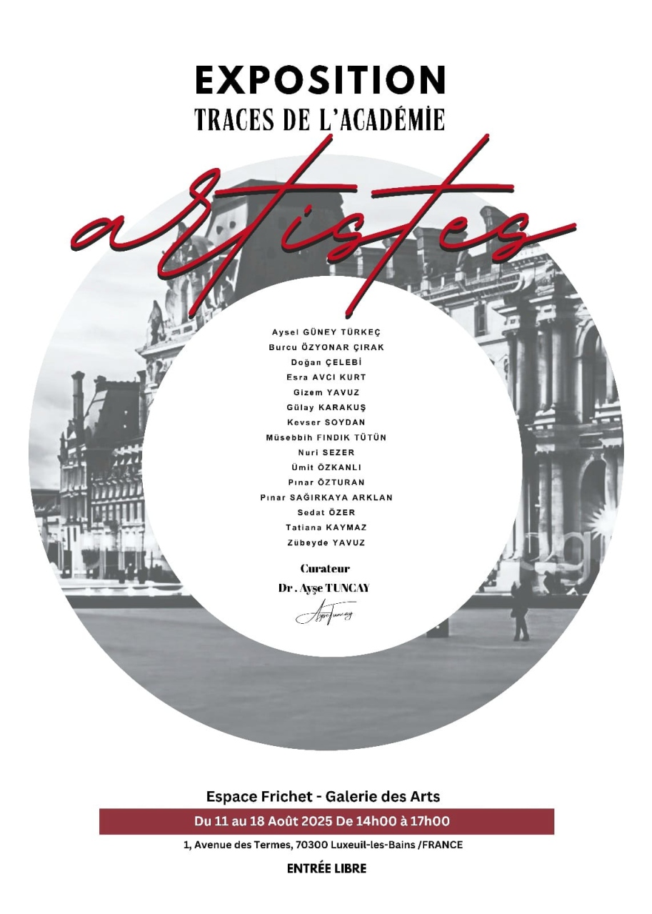 Fakültemiz Öğretim Üyelerinden Doç. Dr. Burcu ÖZYONAR ÇIRAK, Fransa’nın Luxeuil-les-Bains şehrinde 12-18 Ağustos 2025 tarihinde Espace Frichet Sanat Galerisi’nde Küratörlüğünü Dr. Ayşe Tuncay’ın üstlendiği “Akademiden İzler” adlı karma sergiye katılmıştır. Akademik geçmişe sahip 15 sanatçının resim, baskıresim ve illüstrasyon alanlarındaki eserlerini bir araya geldiği serginin açılışı, Luxeuil-les-Bains Belediye Başkan Yardımcısı ve Kültürden Sorumlu Eski Milletvekili Martine Bavard, Audincourt Belediyesi Kültür Müdürü Ersin Arslan, Fransız sanatçılar ve sanatseverlerin katılımıyla gerçekleşti.